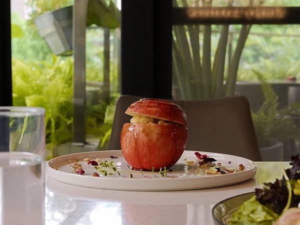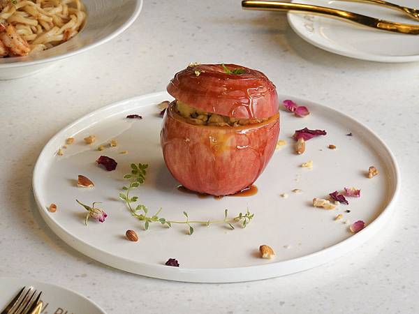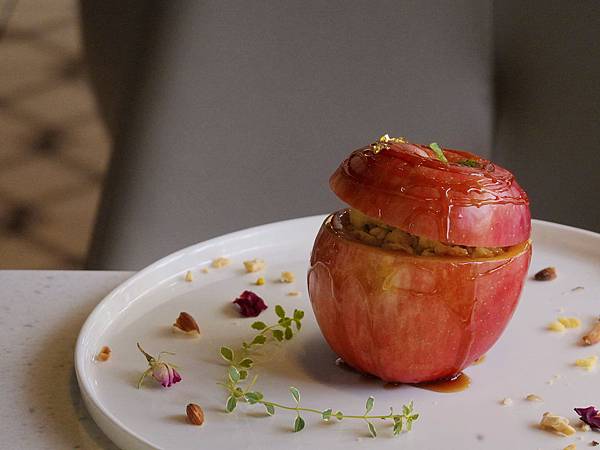 挖至鏤空的新鮮蘋果內佈滿法式脆餅、