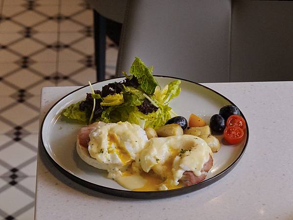 鬆軟的馬芬麵包上佈著煙燻火腿和主角水波蛋,